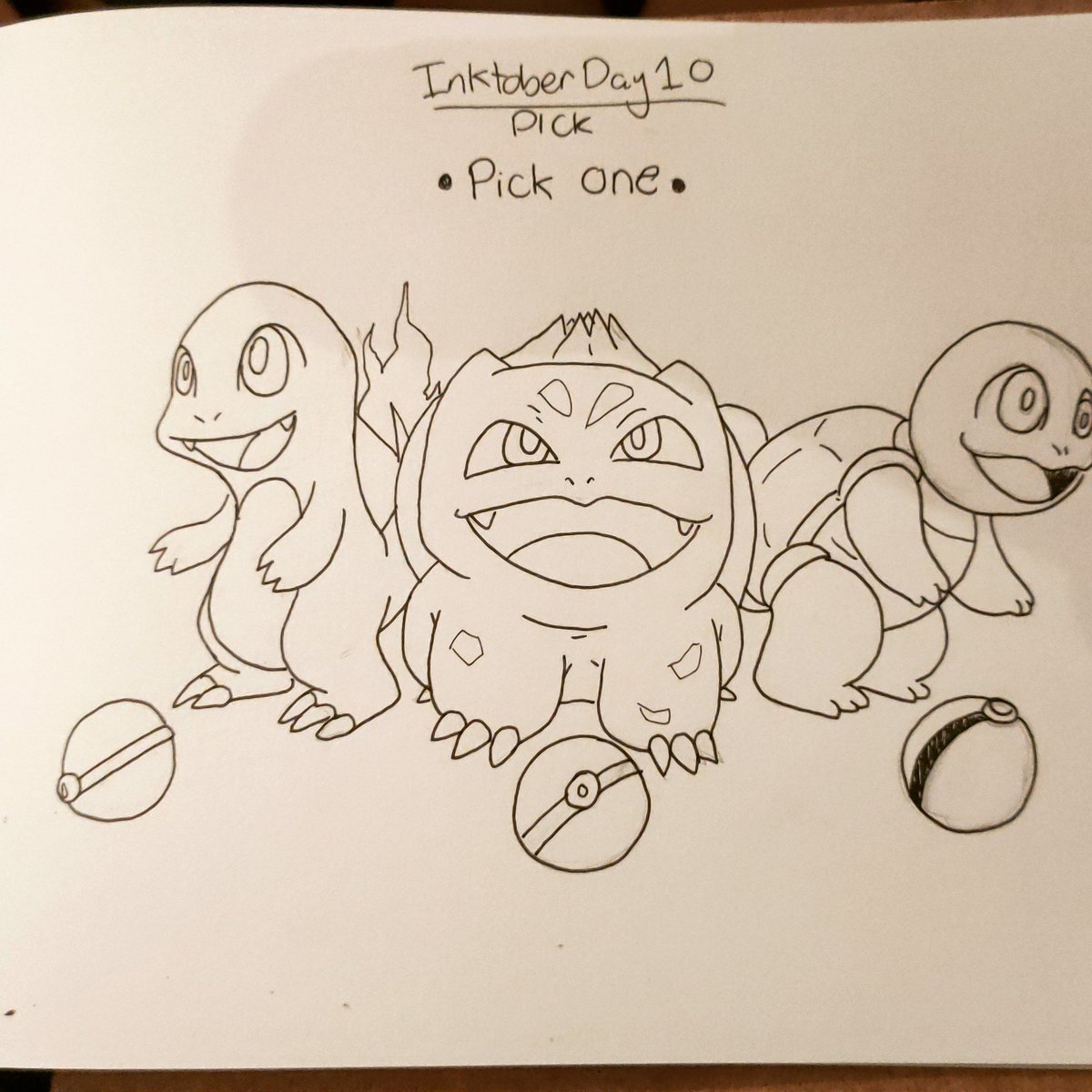 Day 10 - Pick. Featuring Bulbasaur, Charmander and Squirtle from Pokémon. #inktober2021 #inktober2021day10 #Pokemon #PokemonGO #pick