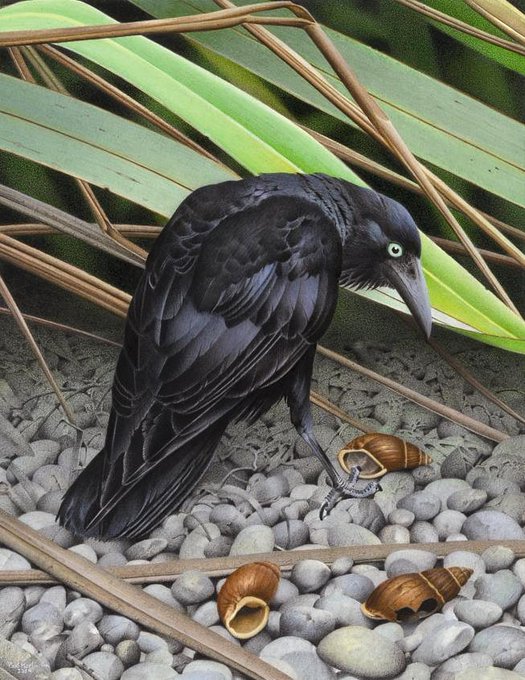 New Zealand raven (Corvus antipodum) W/C on paper 298x232mm 2004 [This image has a rights statement of © Te Papa CC BY-NC-ND 4.0] #Extinct #NZ #birds #corvid #sciart #paleoart #scientificillustration #wildlife #nature #corvidae #Placostylus #snails #TwitterNatureCommunity