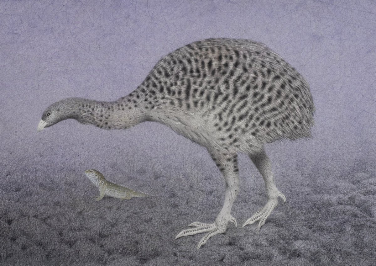 Upland moa(Megalapteryx didinus) compared to a young tuatara watercolour on paper, 68X88cm 2019 Extinct about 1400AD Reconstruction based on fossil bones, mummified remains & feathers #paleoart #newzealand #nzbirds #ratite #moa #extinctspecies #vogel #oiseaux #sciart #uplandmoa