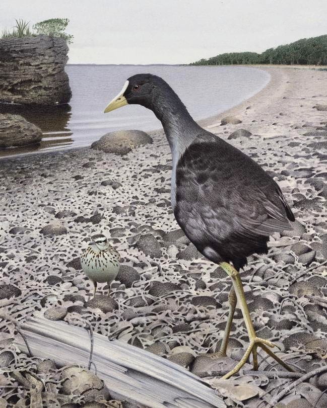 New Zealand swan | Matapu (Cygnus sumnerensis) Oil on board 300x400mm 1990 Reconstruction based fossil bones Extinct about 1450AD mainland NZ Cause; human hunting #newzealand #aotearoa #chathamislands #extinct #nzswan #paleoart #scientificillustration #sciart #ornithology