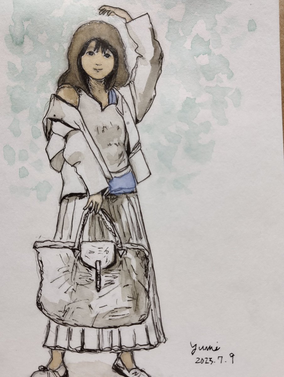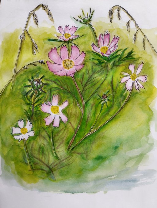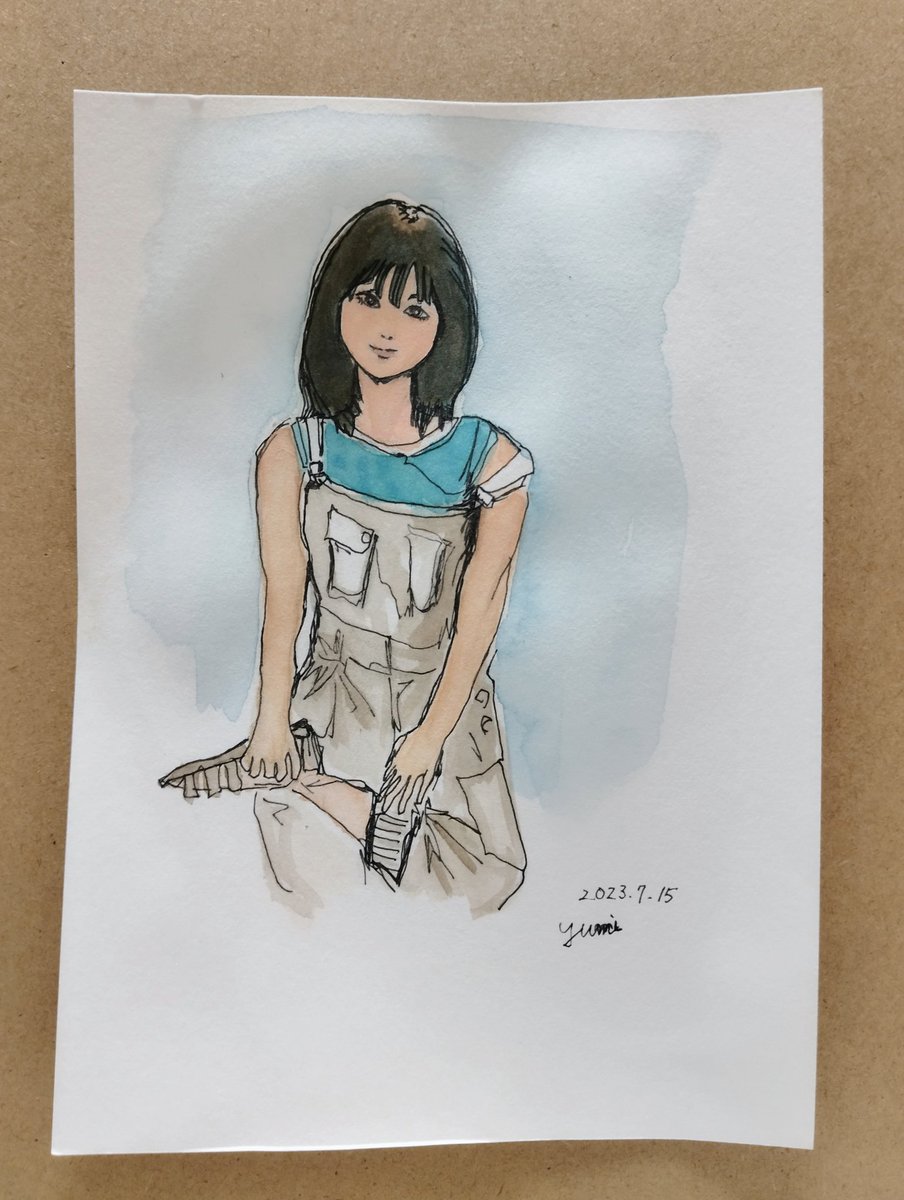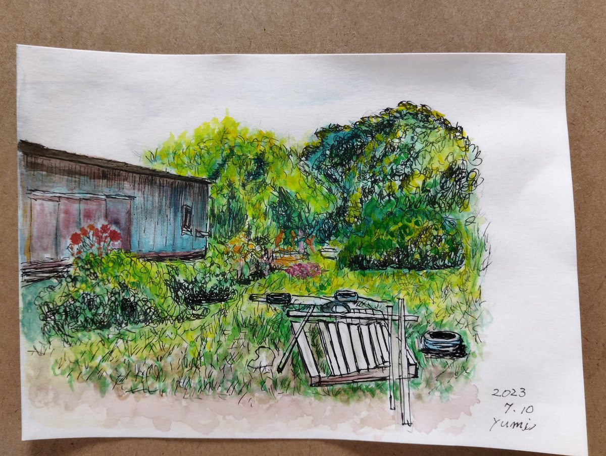 昨日の庭スケッチ 。(木と自転車) 夕方色入れていて帰宅した旦那に見てもらってたら🎨自分で描き始めて(色んな所足していた)ここどこ? みたいな仕上がりに。。夜設定で カモメ飛んでるし、(柴崎先生ので真似らしい) 乗っ取られ感満載ですが…載せます。 #つらら庵お散歩スケッチ #絵 #風景画