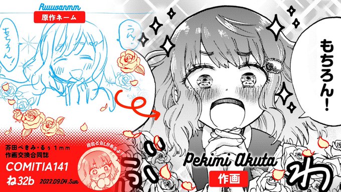 #COMITIA141 #コミティア141 🌹新刊情報補足🌹 コミティア141で頒布する新刊はるぅ1mmさん(@Ruu_neptune )と互いのネームを交換した作画交換合同誌です!いつもと違った両作家の話が読める一冊となっております😀