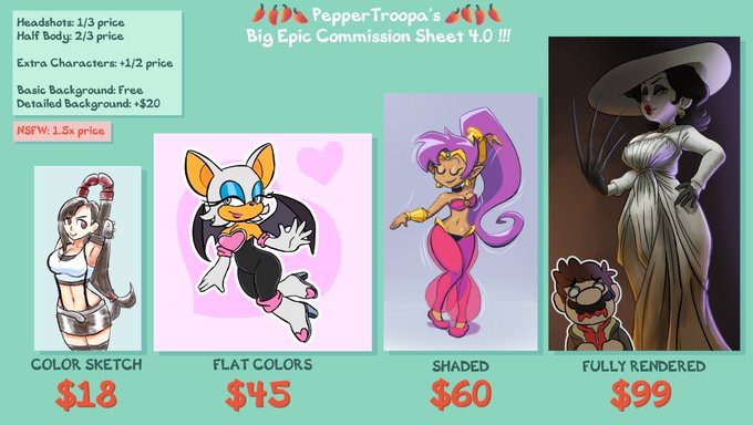 Finally opening my commissions again! Here is my updated comm sheet. If you're interested in a commission or have any questions, please message me on Twitter! (Check below for rules)
