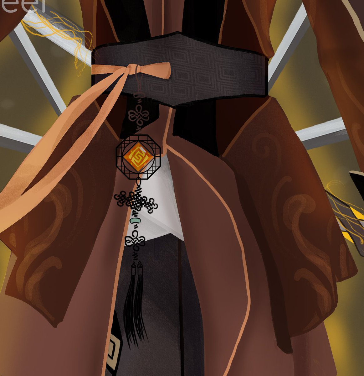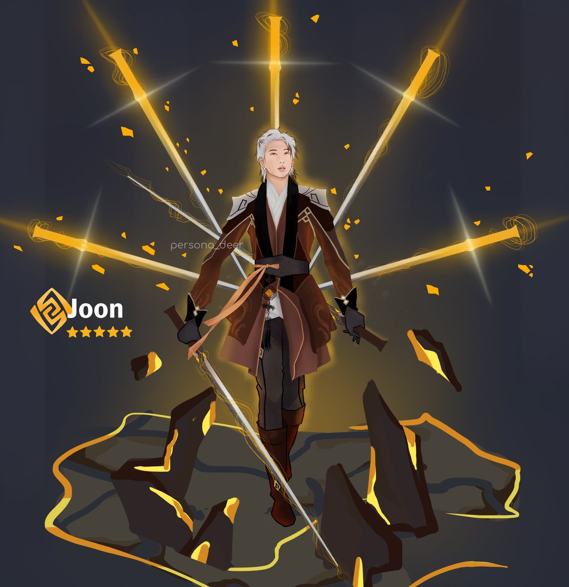 I present you! A new Geo character! 😌JOON 😌 I drew Joon as Zhongli! But changed a few aspects: His dress! I modified it to be more traditional Korean (ref. @funy7) He's a sword wielder! (7 swords🥺) #btsfanart #namjoon #RM #GenshinImapct