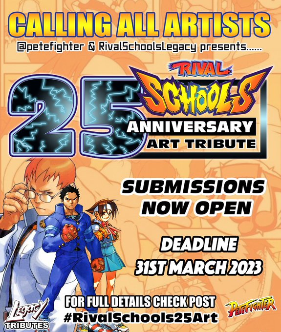 CALLING ALL ARTISTS! @PeteFighter @Rival_Schools_ @S_FighterLegacy @legacytributes SUBMISSIONS NOW OPEN For our next art tribute RIVAL SCHOOLS 25th ANNIVERSARY ART TRIBUTE #RivalSchools25Art #RivalSchools #Capcom NEW DEADLINE MAY 31st RT’s appreciated 👇MORE INFO IN THREAD👇