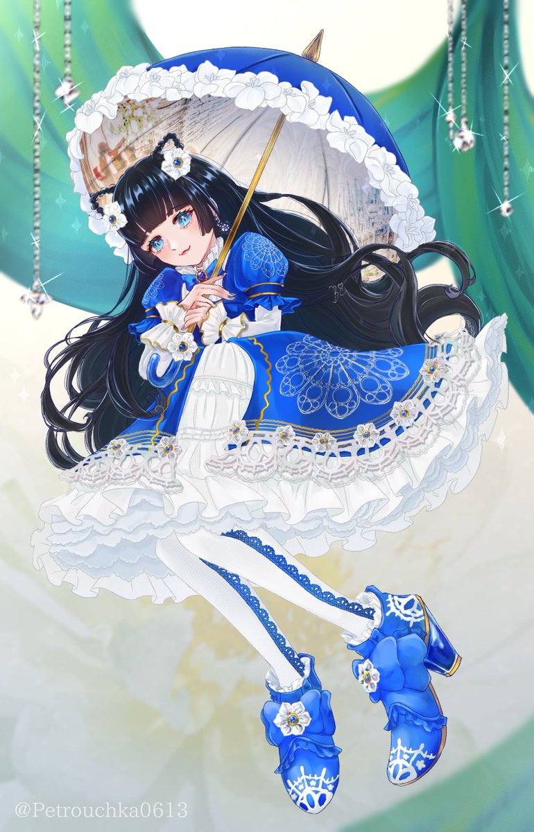 完成〜💎✨ 海月ちゃんにもらった花・ふりひら・上品などの要素でうちの子ドレスアップ! 1度着せてみたかったロイヤルブルーの衣装……我ながらとても良い⸝⸝> ̫ <⸝⸝ ︎ #ibispaint #イラスト twitter.com/Petrouchka06…