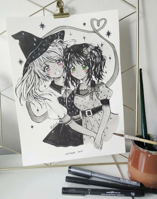 Inktober Day 2, Familiar. Hoy vengo con dos personajes de hace la tira de años!! La morenita de nombre Hatsume, le pertenece a mi amiga @kurumi_eiri y la otra chica es mi pj Sayuri! #inktober19 #inktober #ink #inking #raqueltraveink19 #witch #oc #inktober2019 #inktoberday2