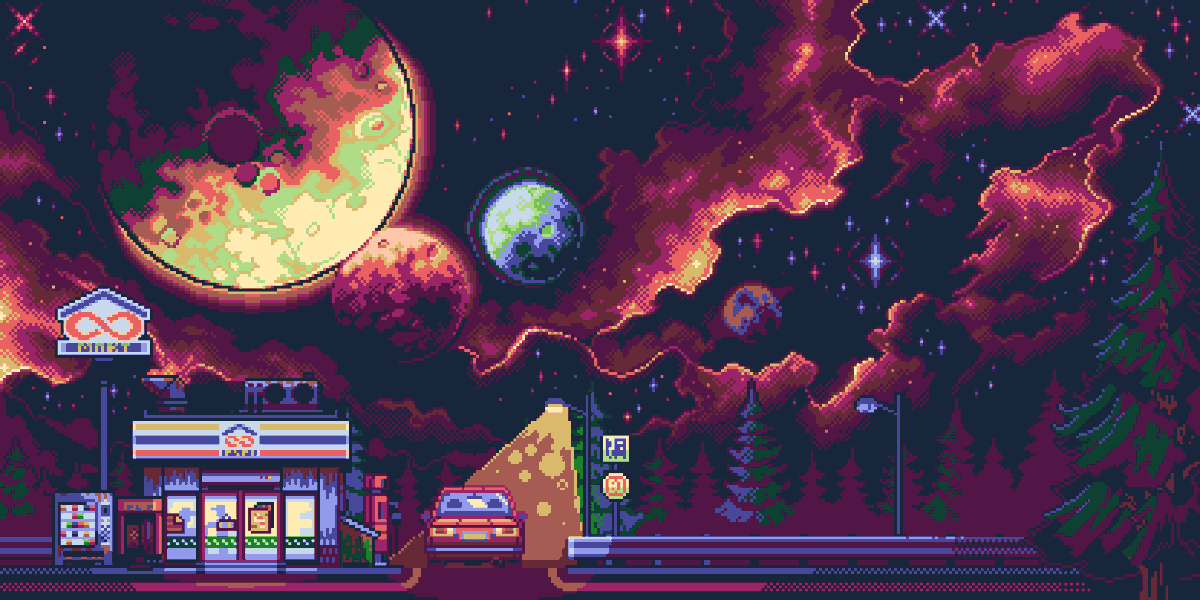 Weird sky and some convenience store in the middle of nowhere. First #pixelart post of 2021, a little late lol.