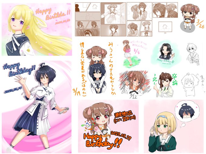 #今月描いた絵を晒そう 細々したのを結構描いてましたね。さくみう誕は結構頑張ったつもりです😭 あと、ちょっとした漫画を初めて描いてみましたがこれは労力の割にアレだったのでもうしばらくやらない…と思う🫠 4月以降ちょっと頻度落ちるかもですがよければまた見てください🙏🙏🙇♀️
