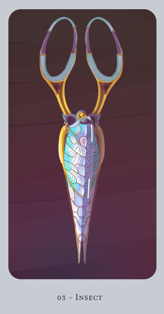 #swordtember Day 3 - Insect Despite it's extravagant appearance, the Screaming Sheers are more brutal than they are beautiful. Made from the wings of great cicadas, these scissors scream as they snip. Harmonizing with the anguish they inflict.