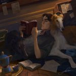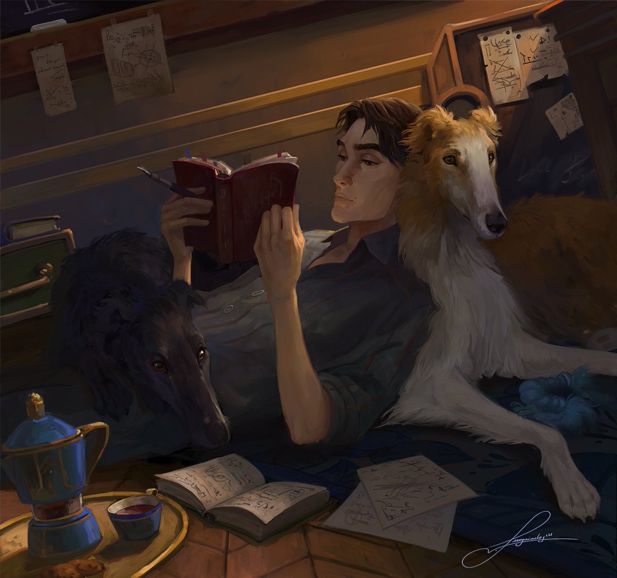 My contribution to #arcane fandom) VIktor with borzoi, just chilling in lab in-between of experiments. i decided to drew series of #arcanefanart about characters and dog breeds that i associate them with)