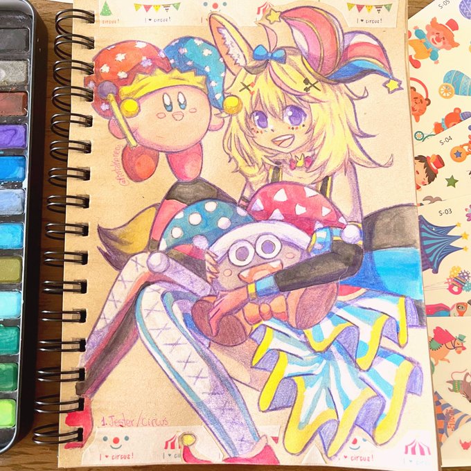 Polka con Kirby y Marx uwu Hecho con acuarelas y lapiz de color dia 1. Jester / Circus #絵まる #hololive #cutegirltober2022