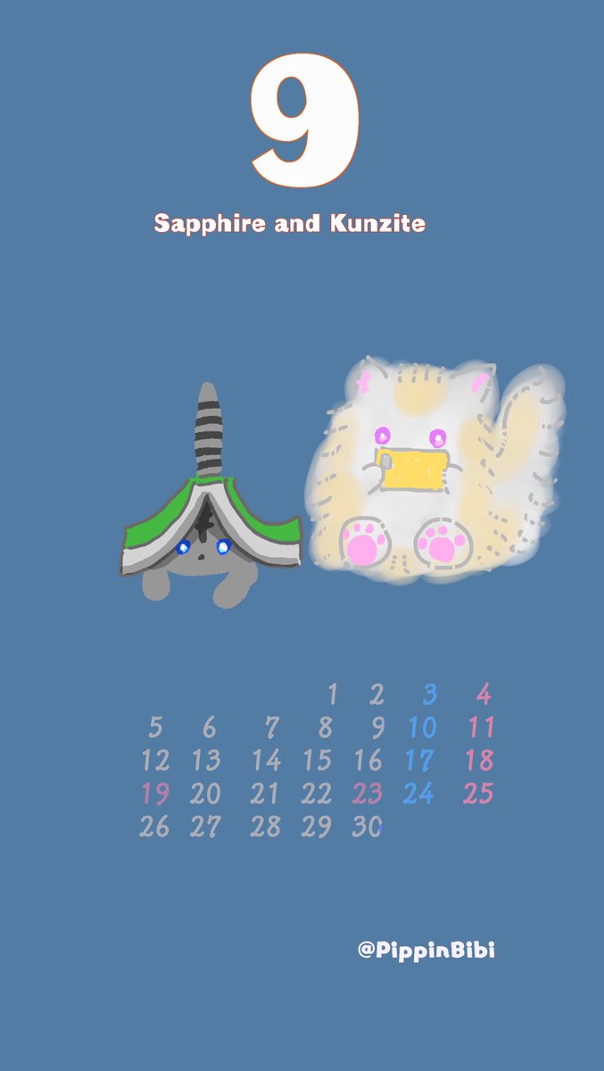 9月の猫✖️誕生石カレンダーです 今月はサファイア&クンツァイト✨ 読書(?)の形は猫それぞれ😽 私的利用の範囲でしたらご自由に🤗 #カレンダー #イラスト