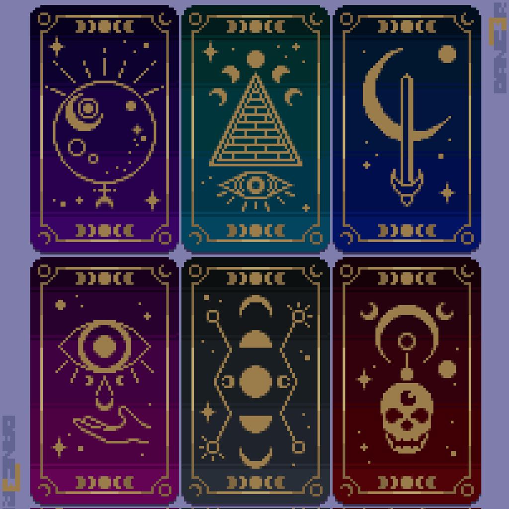 DAY 5 - CARD 🃏 [Tarot Style Cards] Size: 60x100 each one Palette: 15 colors each one Time: 1 hour 30 min [Fact: I don't know anything about Tarot 😅] #pixeltober2021 #Pixeltober #pixelart #ドット絵