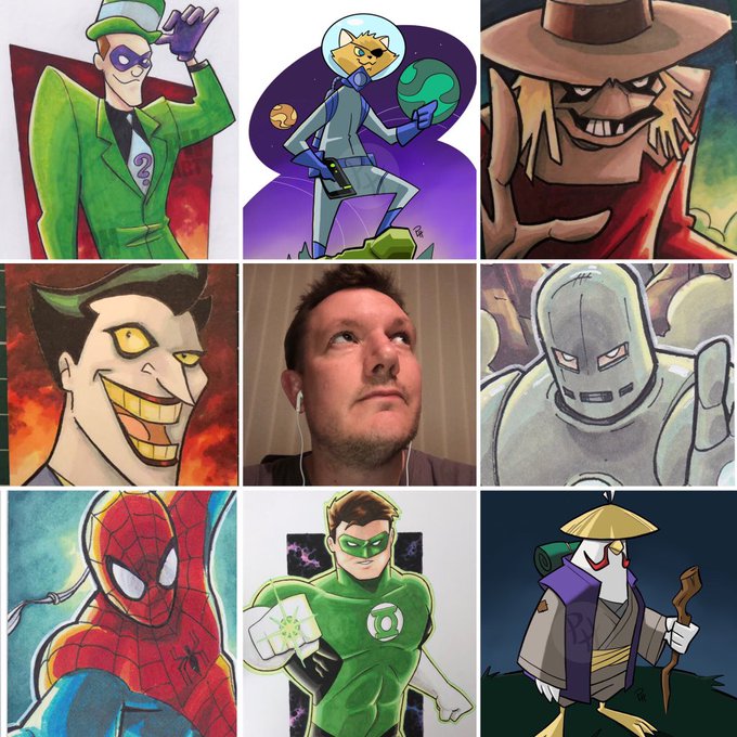 Doing the #artvsartist thing... I’m in here somewhere... maybe under the scarecrow costume 🤔 . #artvsartist2019 #batmantas #dcau #marvelcomics #sketchcards #DigitalArtist #digitalart #fanart #btas #cartoonist #tradingcards