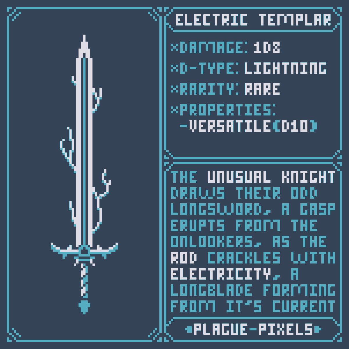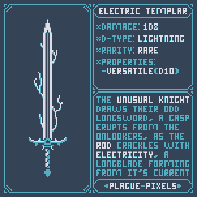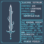 #Swordtember Day 13 + 14 - Electric & Knight "Electric Templar" "The unusual knight draws their odd longsword, a gasp erupts from the onlookers, as the rod crackles with electricity, a longblade forming from it's current." #SwordDesign #dnd5e #pixelart