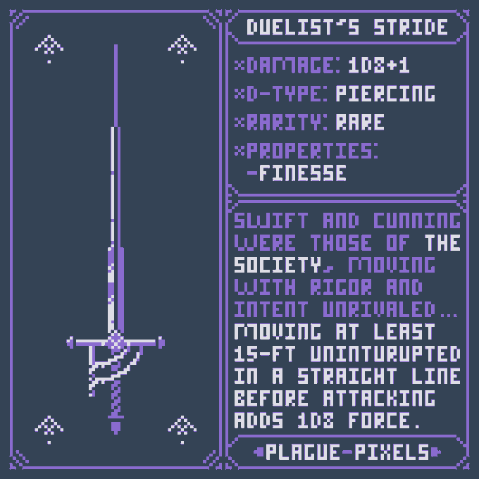 #Swordtember Day 04 - Duel "Duelist's Stride" "Swift and Cunning were those of the society, moving with rigor and intent unrivaled..." #SwordDesign #dnd5e #pixelart