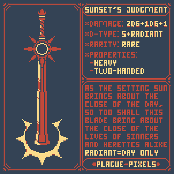 #Swordtember Day 05 - Sun "Sunset's Judgment" "As the setting sun brings about the close of the day, so too shall this blade bring about the close of the lives of sinners and heretics alike" #SwordDesign #dnd5e #pixelart