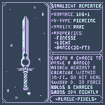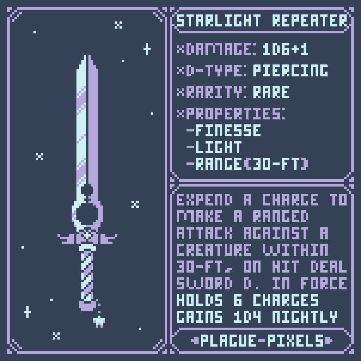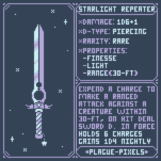 #Swordtember Day 07 - Stars "Starlight Repeater" "Expend a charge to make a ranged attack against a creature within 30-ft, on a hit deal the sword's damage in force damage. Holds 6 charges and regains 1d4 nightly." #SwordDesign #dnd5e #pixelart