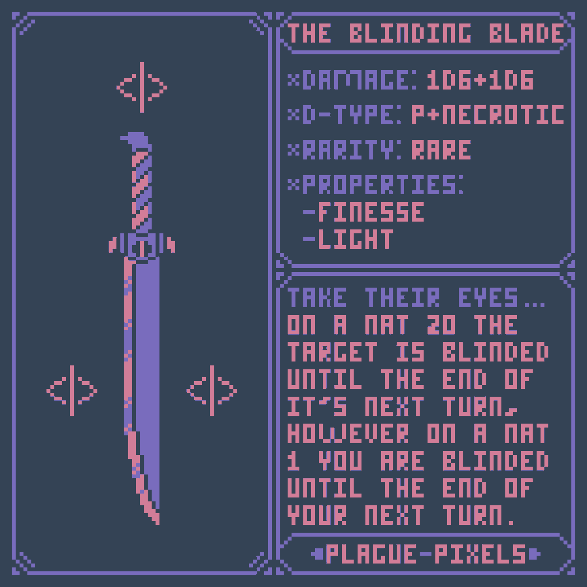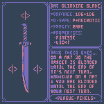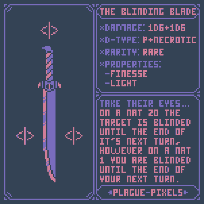 #Swordtember Day 08 - Cursed Relic "Blinding Blade" "Take their Eyes... On a Natural 20 the target is blinded until the end of it's next turn, however on a natural 1 the wielder is blinded instead, lasting until the end of their turn." #SwordDesign #dnd5e #pixelart