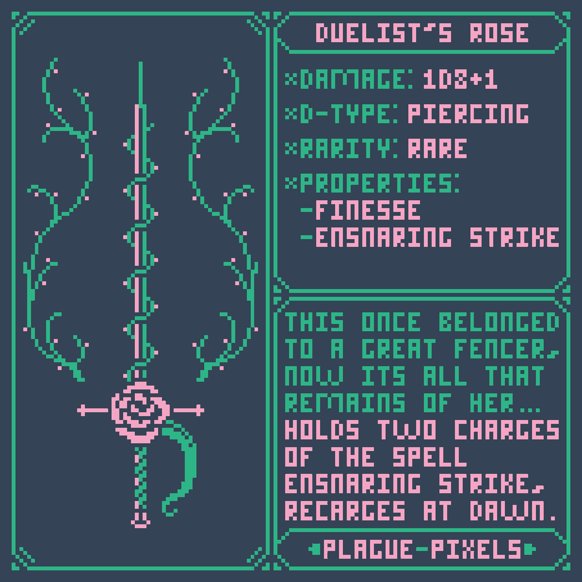 #Swordtember Day 10 - Rose/Thorn "Duelist's Rose" "This once belonged to a great fencer, now it is all that remains of her... Holds twocharges of the spell ensnaring strike, these charges recharge at dawn." #SwordDesign #dnd5e #pixelart