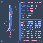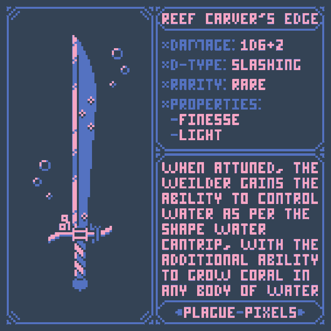 #Swordtember Day 11 + 12 - Elegant & Powerful "Reef Carver's edge" "When Attuned, the weilder gains the ability to control the water as per the shape water cantrip, with the additional ability to grow coral in any body of water." #SwordDesign #dnd5e #pixelart
