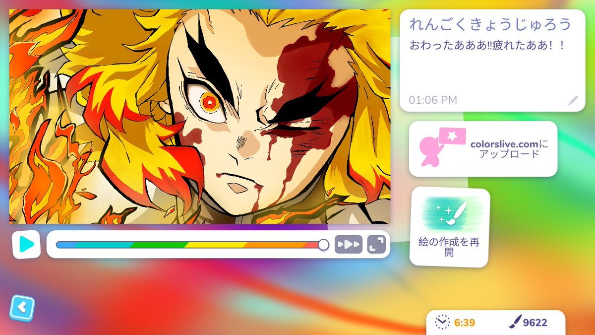 0 2 煉獄杏寿郎描いた!!!!(Switch) スイッチ慣れてないから6時間40分もかかったー!!…疲れた(|||´Д`) 機能はスマホのペイントツール程じゃないけど、これはこれで楽しい! #NintendoSwitch #colorslive #rengoku #DemonSlayer #鬼滅の刃 #煉獄杏寿郎 #デジタルイラスト 22/03/28 07:06
