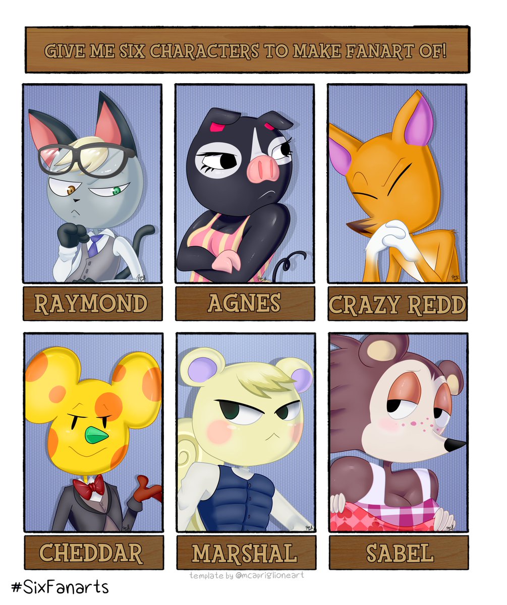 Eeeyyy I got this done! thank you for all the suggestions! it was fun! #SixFanarts #AnimalCrossingNewHorizons #animalcrossing #Raymond #Agnes #Crazyredd #Cheddar #Marshal #Sabel