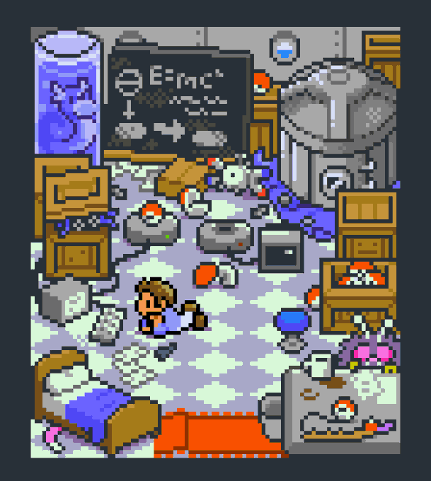Bill's room on the SS Anne for the #KantoRedrawn project. If he hadn't given his ticket to the player, he probably would've spent the whole time locked in his room working on the #Pokemon Storage System. This is some of the most involved #PixelArt I've done in a long while :~)