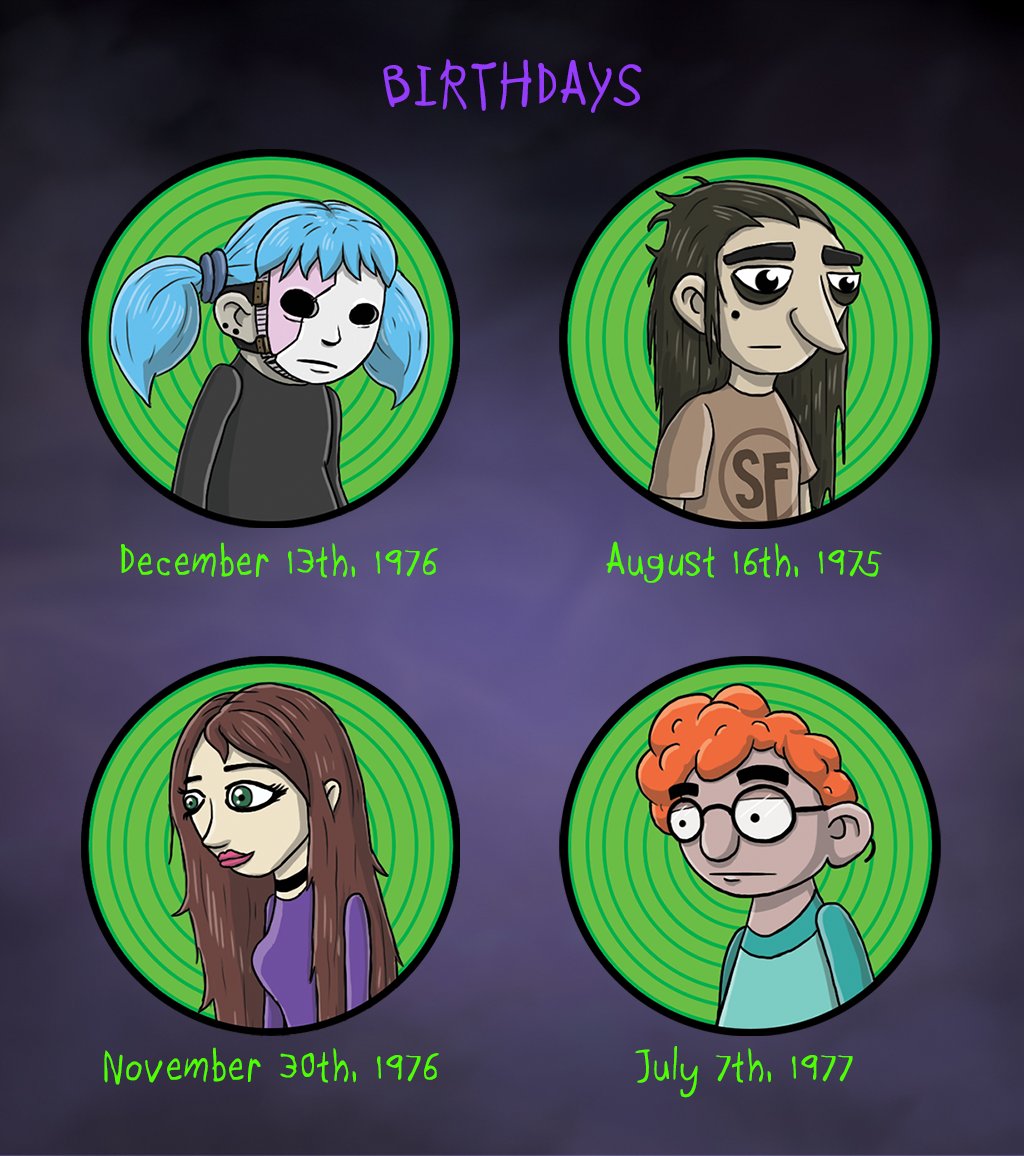 Here are the Sally Face gang's official birthdays! Keep an eye out today, we'll be revealing more stuff and starting Social Goals, which are gonna be a ton of fun! twitter.com/PortableMoose/…