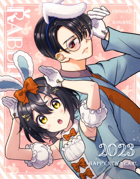 HAPPY😁NEW✨YEAR🎍 今年ももっちゃん(@dan_mcmr )とうのこが合作描かせていただきましたっ(⸝⸝⸝ᵒ̴̶̷ ⌑ ᵒ̴̶̷⸝⸝⸝)✨仕上げも背景も忙しい中本当にありがとうっ最高っ😭🙏✨うさぎのようにピョーンと飛躍の年になりますように🐈⬛🦋♥️今年もよろしくお願いします✨ #ウノスケアート