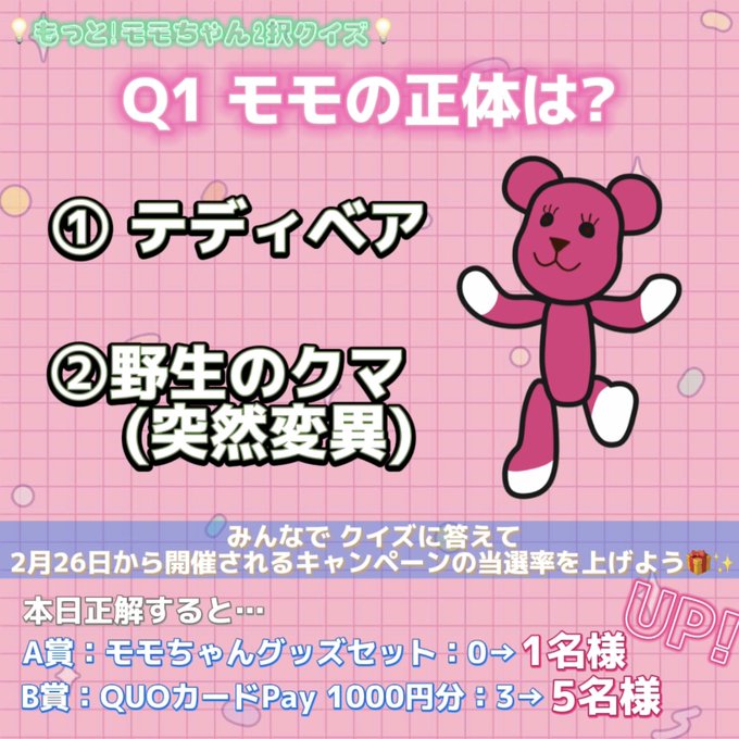 協力プレイで当選率UP✨ 💡もっと!モモちゃん2択クイズ💡 Q1.モモの正体は? ▼回答はツリーの投票ボタンを押してね💓 クイズにみんなで答えて、このあと26日から開催されるキャンペーンの当選率を上げよう🎁 --- 本日正解すると… A賞当選者:0名→1名様 B賞当選者:3名→5名様に!