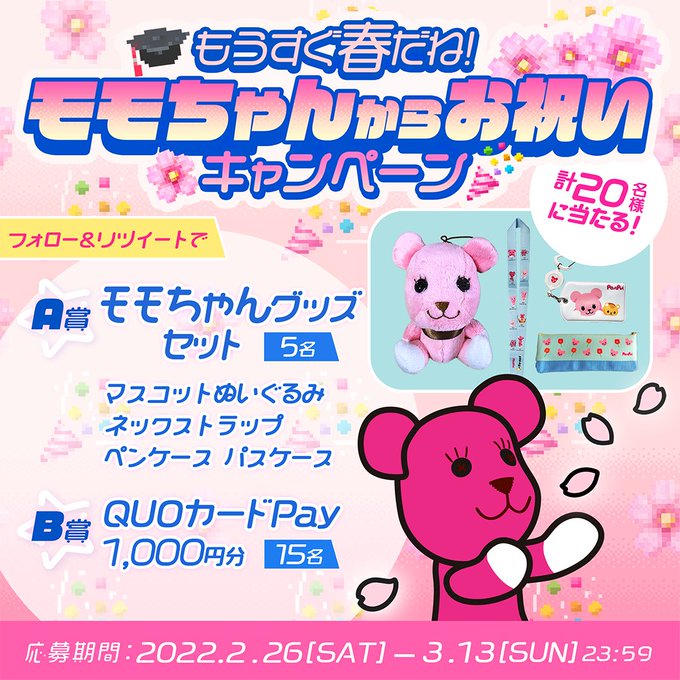 8917 2018 \もうすぐ春だね!/ モモちゃんからお祝い🌸 #キャンペーン フォロー&リツイートで、 この春から使える【モモちゃんグッズセット🧸🌸 】 【QUOカードPay1000円分】が 計 20名様に当たる❣️❣ [3月13日(日) 23:59まで] みんな の かどで を おうえん( 'ω' و(و" #懸賞 #プレゼント #QUOカードPay 22/02/26 20:00