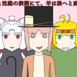 #ふにん画す 7/17の回で、けむりさんとのえぞうさんと戌宮さんの3人がインポスター陣営となって、ほぼ疑われることなく全員生存して勝利したシーンを描きました! 羊スキンの2人を率いるけむりさんが羊飼いみたいに思えたのでそれっぽい衣装も着せました ニコニコ静画seiga.nicovideo.jp/seiga/im109969…