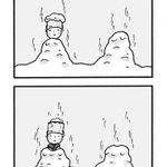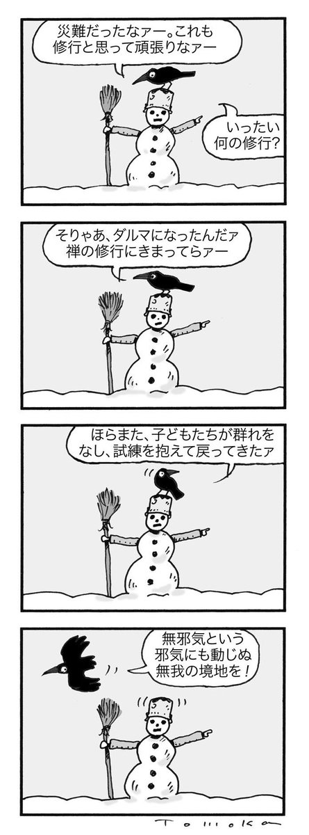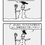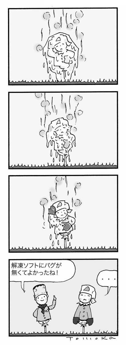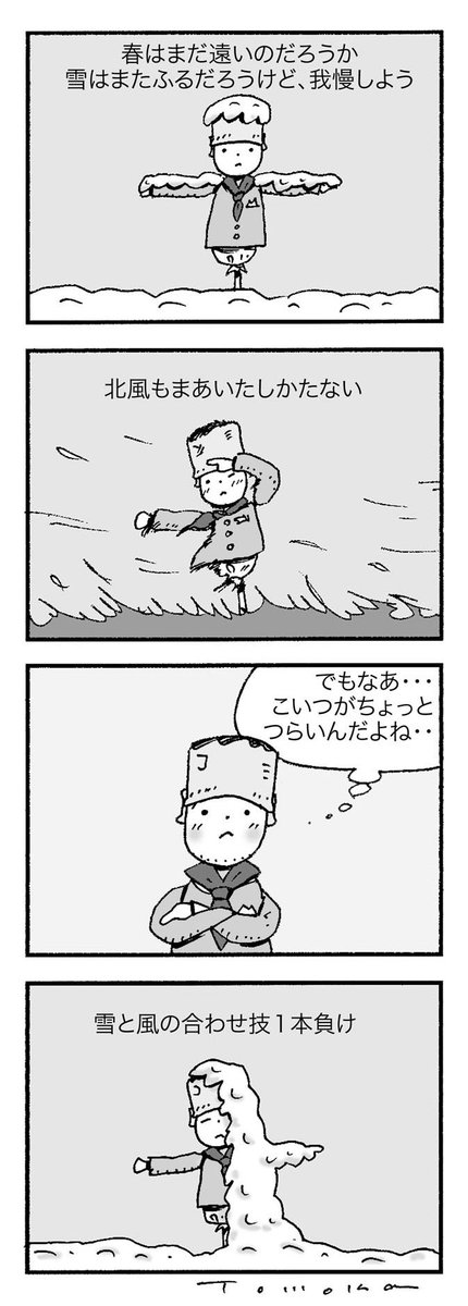 かかしのポッティー 「戻り寒波の逆襲・溶けるの巻」 再掲。すっとぼけたカカシたちの寸劇。続き物もあるので気になったら以前のも見てね! #4コマ漫画 #イラスト #マンガ