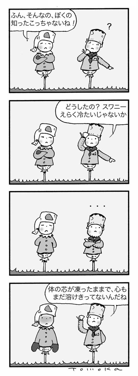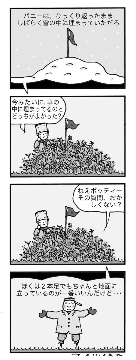 1 2 かかしのポッティー 「雪原のミステリー」 再掲。すっとぼけたカカシたちの寸劇。続き物もあるので気になったら以前のも見てね! #4コマ漫画 #イラスト #マンガ 23/02/26 06:51