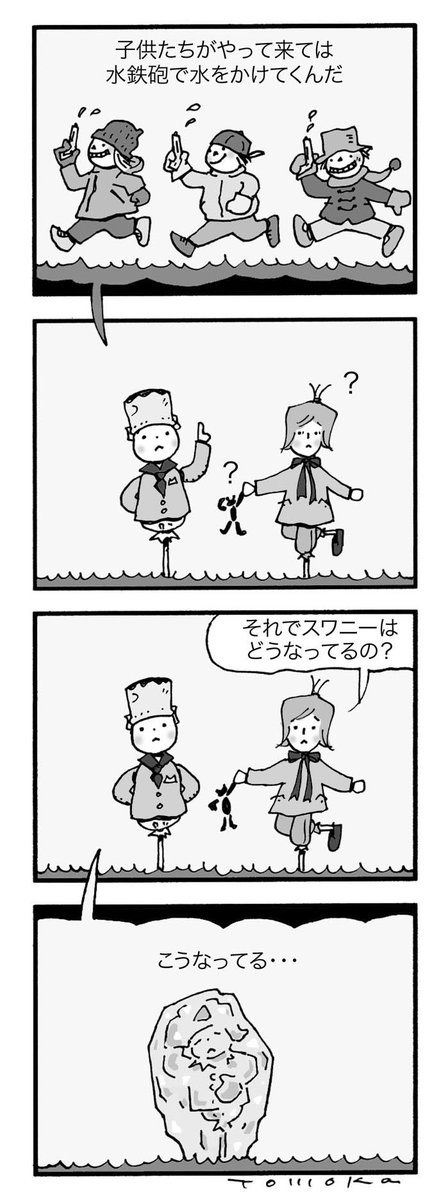 かかしのポッティー 「欲ぼけスワニーのちょっと怖い話」 再掲。すっとぼけたカカシたちの寸劇。続き物もあるので気になったら以前のも見てね! #4コマ漫画 #イラスト #マンガ