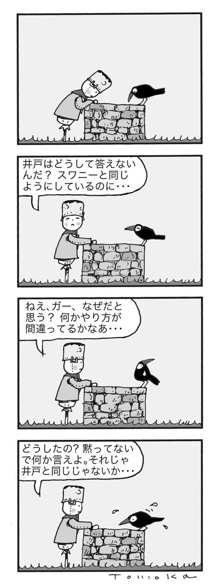 かかしのポッティー 「沈黙のガー」 再掲。すっとぼけたカカシたちの寸劇。続き物もあるので気になったら以前のも見てね! #4コマ漫画 #イラスト #マンガ