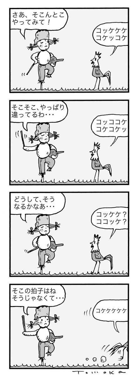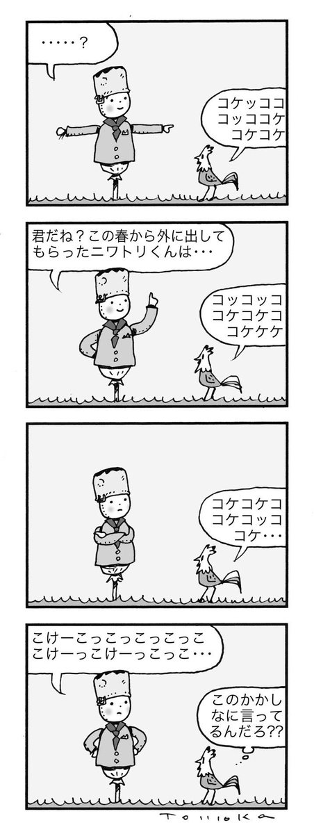 かかしのポッティー 「コッコはコッコ」 再掲。すっとぼけたカカシたちの寸劇。続き物もあるので気になったら以前のも見てね! #4コマ漫画 #イラスト #マンガ