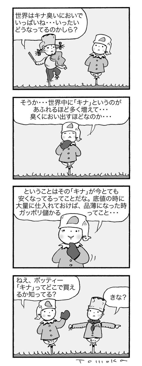 0 4 かかしのポッティー 「わらしべ」 再掲。すっとぼけたカカシたちの寸劇。続き物もあるので気になったら以前のも見てね! #4コマ漫画 #イラスト #マンガ 23/03/25 07:36