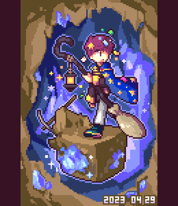 11 27 クリスタル洞窟のドットヴィネット!💎 キャラはテラリアの自キャラ✨髪の毛から紙吹雪が出るんだよ~🎉 #pixelart #ドット絵 23/04/29 07:47