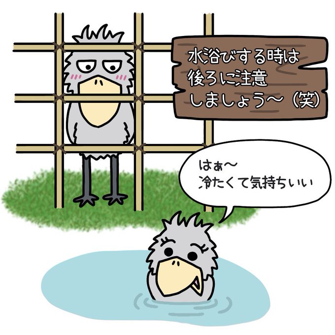 ハシビロコウたちの水浴び🌻 ハシビロコウは暑くて日差しが強い日、よく水浴びをして涼みます。 しばらくお水に浸かってる姿はまるで露天風呂に入ったように気持ち良さそう🥰ただ覗きに注意です🤣 ↓↓↓インスタで詳しく😉 instagram.com/p/CghDthTvBRF/… #イラスト