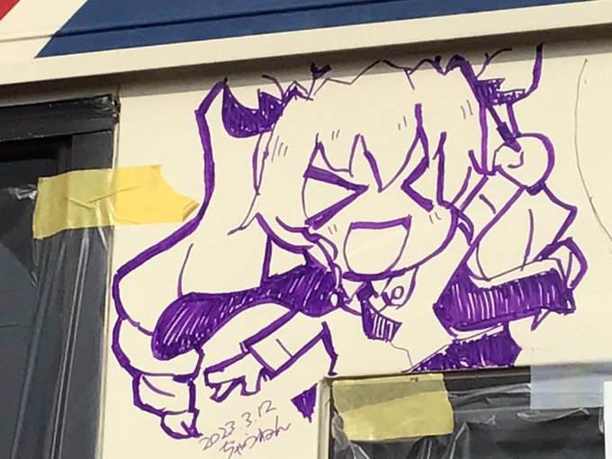 今週は色々辛いからどうしようかな迷ってましたが、行ってきました海楽! 昼前に着いたけど人が多すぎず少なすぎずで屋台にそんなに並ばなくてよくて良かったです! そんな本日の落書き あと浜勘さんのところにも描いてきました #海楽フェスタ2023 #らくがきばす #茨城交通