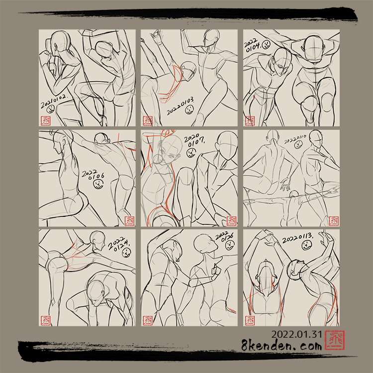 #今月描いた絵を晒そう 毎朝の基礎錬からいくつか。 今月はとにかくスピード重視で鍛錬メニューもどんどんアップデートしましたが、原稿やキャラ絵への取り組み方にも変化が出て収穫の多い1ヶ月でした😊 毎日の記録はサイトのOUTPUT(道場)にφ(˘ω˘ ) 8kenden.com #P8絵の鍛錬 #日々描く
