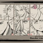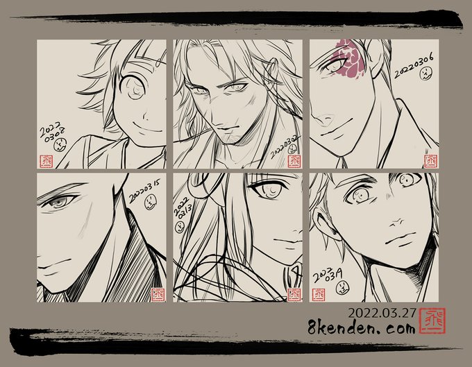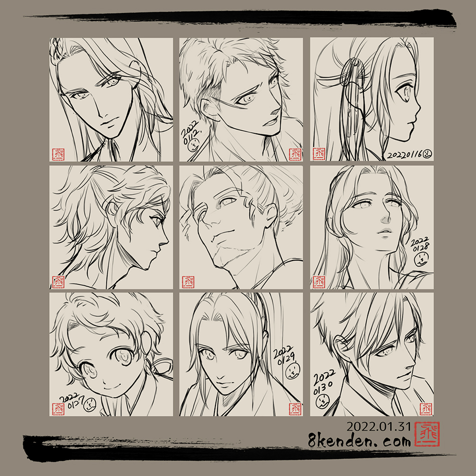#今月描いた絵を晒そう 最近上げたのをざっと選んでみたらちゃんと八犬士8人揃ってました。これは嬉しい!あまり偏りなくみんな描きたいのです🥰 スピードと安定感を両立させるトレーニングに励んでます。 2月も今のメニュー中心の朝練でキャラ絵を強化したいです🌱 #幻創里見八犬伝 #P8絵の鍛錬