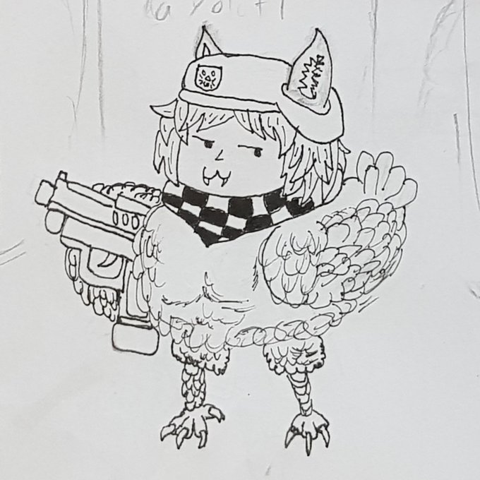 Right, that's most of my old sketches posted, now on to #inktober2021 / #campaigntober #inktober2021day3 "Uwa~ all your chimkens are belong to us" [Note to self, draw the three supporting characters eventually] #chickencatte #inksketch #animegirlart #animesketch #gun #sketch