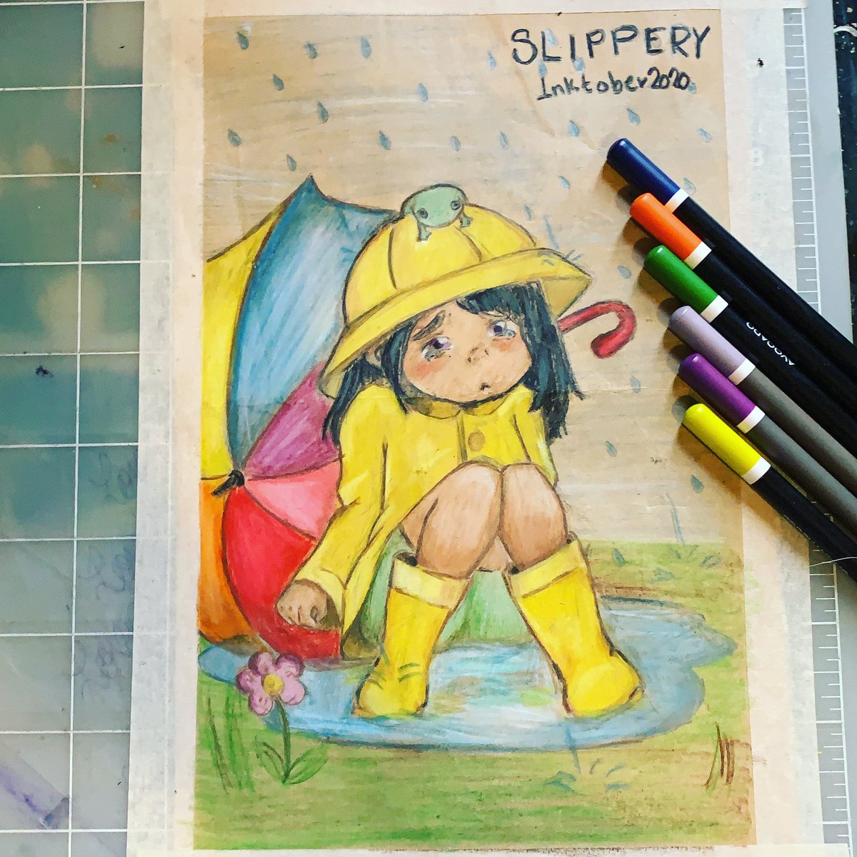 Inktober day 12 Slippery De verdad que bonito se siente cuando te gusta lo que haces, espero que lo disfruten tanto como yo :) #Inktober #inktober2020 #Inktoberday12 #slippery #RainyDay #rain #frog #art