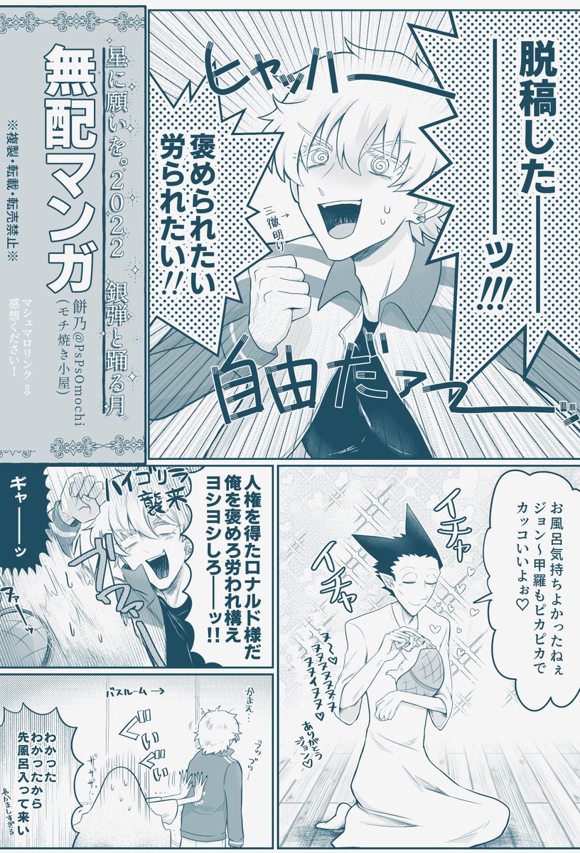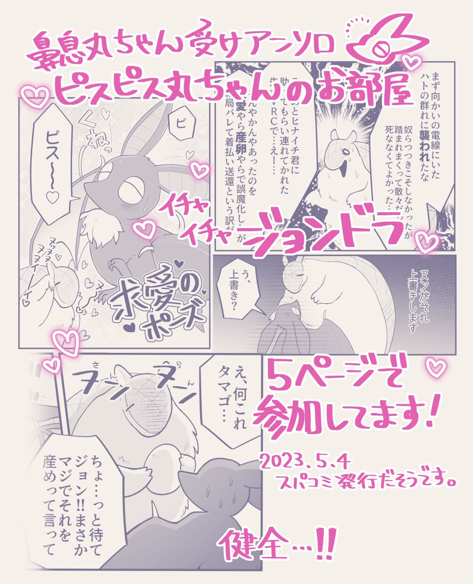 40 235 鼻息○ちゃん受けアンソロ『ピスピス丸ちゃんのお部屋』(@pisupisumaru_)へ5pで参加させて頂きました!5/4のスパコミにて頒布されるそうです、よろしくお願いします〜!🦇🟣✨ 23/03/08 18:47