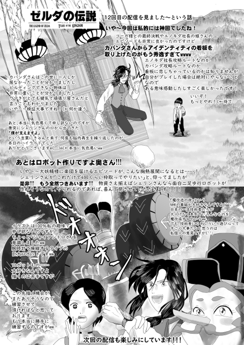 シェリンさんのティアキン配信(12回目)の感想が描けましたので、ソロっと置かせていただきます 12回目……6時間ありましたが、神回でしたね……! ああいう攻略には何の役にも立たない検証大好きなので、これからも色々やってくれたらうれしいなぁ #シェリンの証拠品
