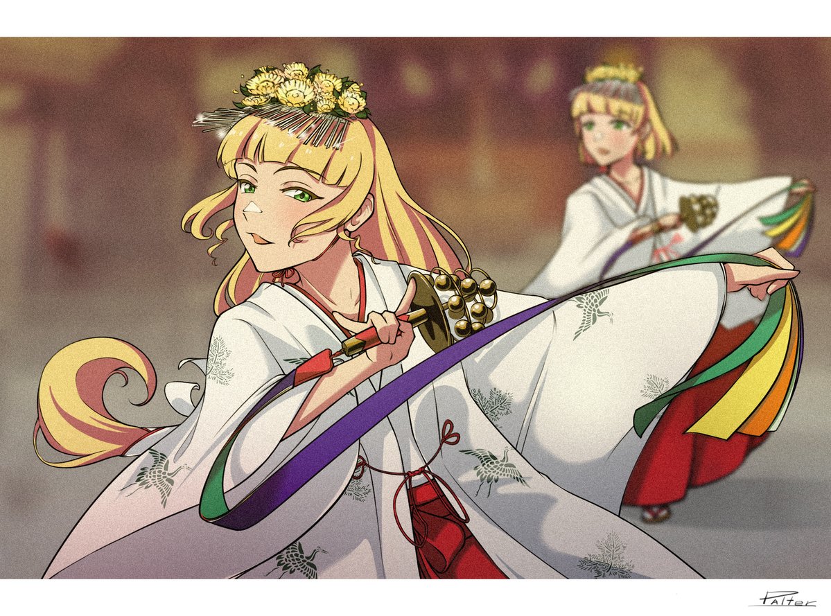 うにゃ先生(@unyanai)が描いた巫女服を着付けしてあげるシーンを、勝手に想像して描いてみましたーー P.S.参考あり #Liella #クゥすみ